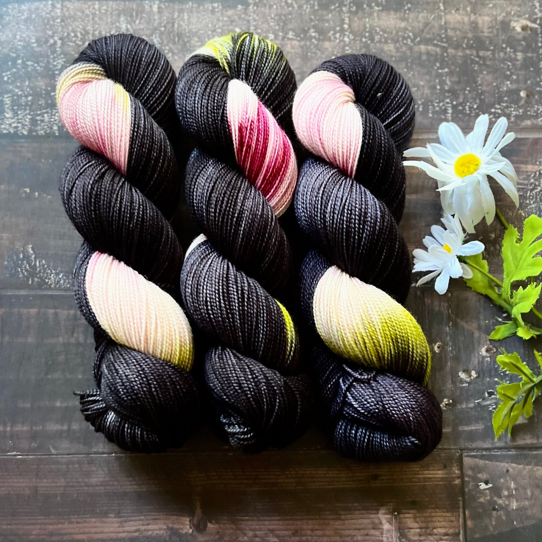 It's kind of like a black hole, I can't stop looking at it. Really happy I took the chance (having been disappointed in "black" yarns before) because this is a stunner. The black is like coal, so the pool of chartreuse/white/pink is shocking in contrast. Going to have to find the PERFECT assigned pooling project for this color, it'll be amazing!