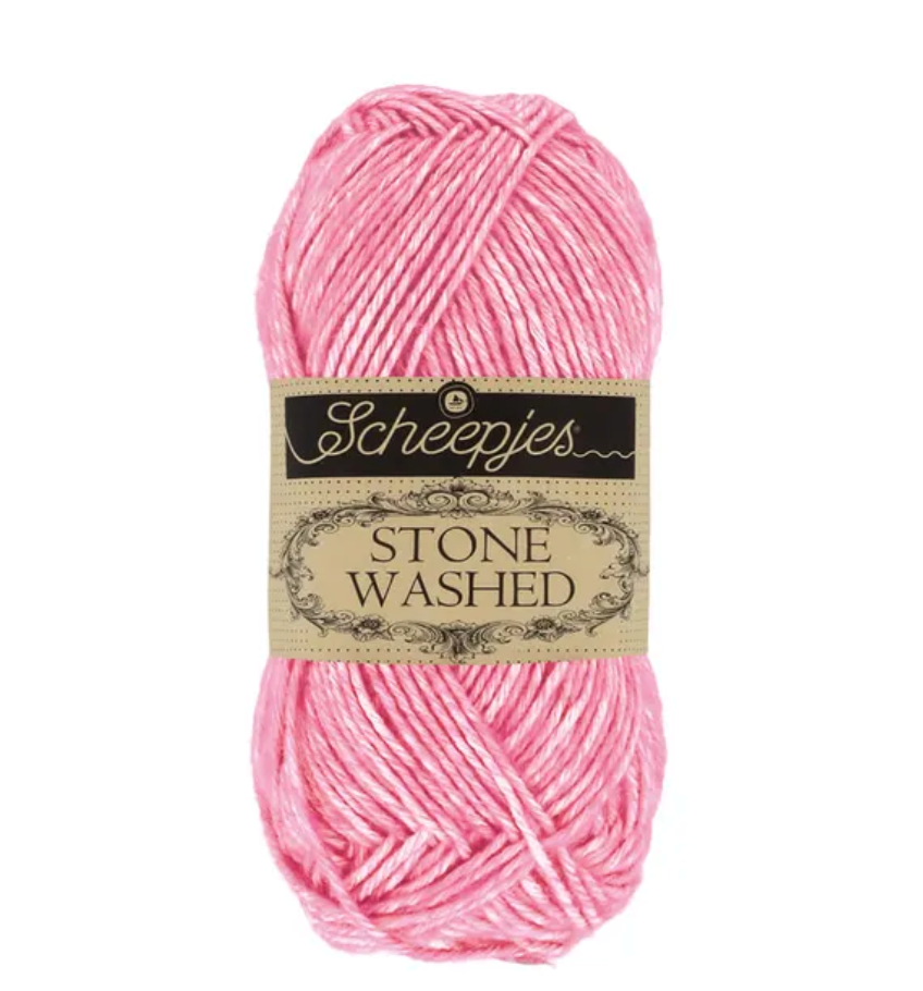 Scheepjes Stone Washed is a silky soft yarn that has the breathable quality of cotton, but is strong and easy to maintain. The Stone Washed appearance is due to the unique production method of colorful fluffy acrylic fibers blown into a net of ecru-colored cotton. We love this for granny squares, amigarumi (toys), bags, blankets, tops, anything your heart desires. This is super soft and a great all around yarn.