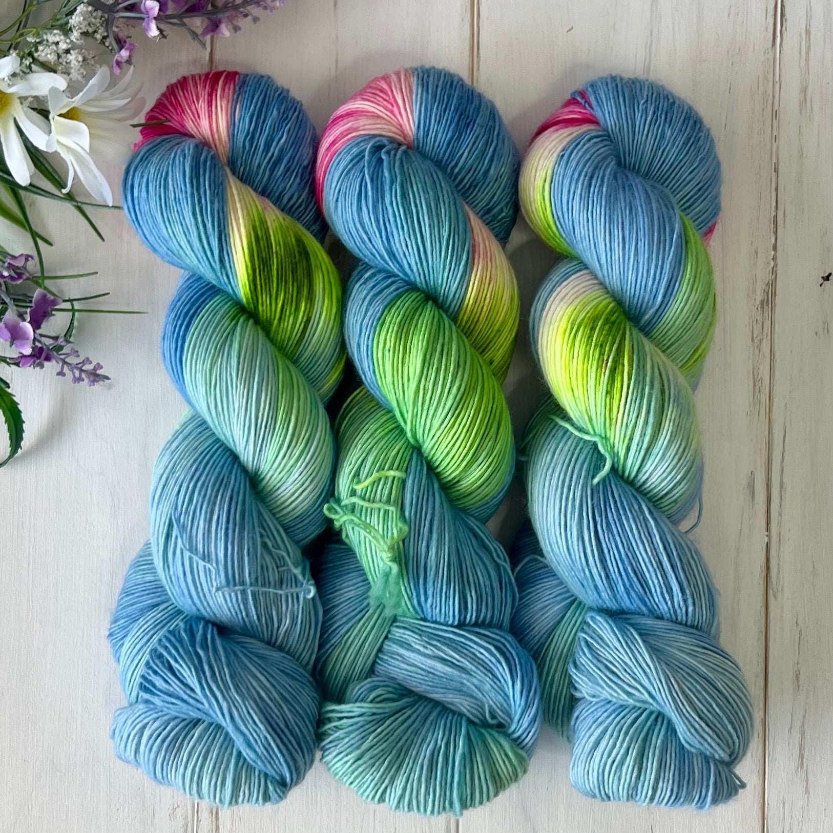 Apple Blossom is a soft delicate blue with a pink and green tip to create flowers in assigned pooling projects. This batch wanted to have more of a longer stretch of the green.